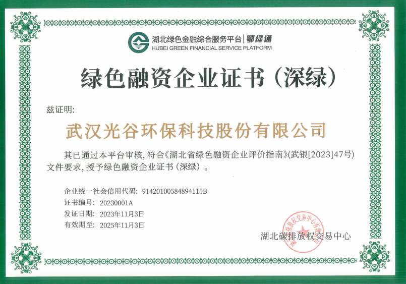 公司旗下光谷環(huán)保憑借氣水領域環(huán)保設施的精細化運營和節(jié)能減排措施的落實,成功獲得綠色融資企業(yè)證書(深綠),成為首批獲評的湖北綠色融資企業(yè),在貸款利率、授信額度、貸款期限等方面將獲得更多的融資支持。
